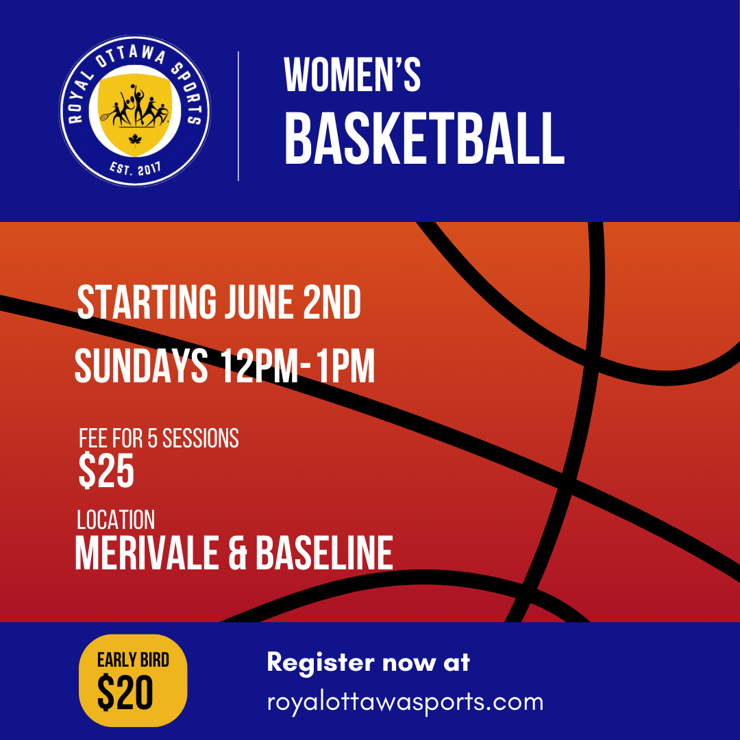 Women’s basketball will be on Sundays from 12pm-1pm starting June 2 to July 14 at Merivale and Baseline area. More details at registration.